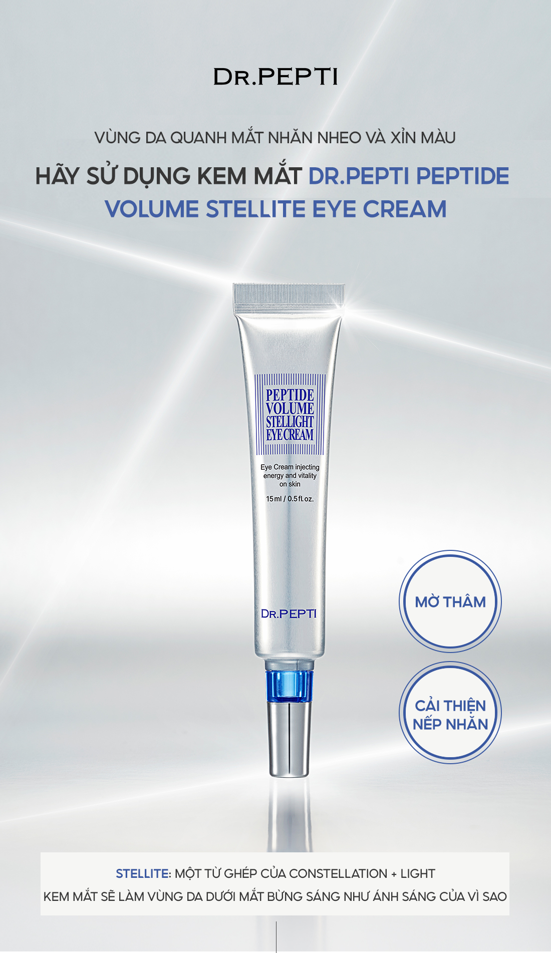 Kem dưỡng mắt tái tạo toàn diện từ tế bào gốc Dr.Pepti Peptide Volume Stellight Eye Cream giúp trẻ hóa xóa mờ nếp nhăn vùng mắt, cải thiện vùng da mắt nhăn nheo chảy xệ thâm xỉn trở nên tươi sáng căng mịn.
